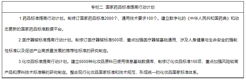 1.持續(xù)推進(jìn)標(biāo)準(zhǔn)體系建設(shè)。繼續(xù)開展國家藥品標(biāo)準(zhǔn)提高行動計(jì)劃。編制2025年版《中華人民共和國藥典》。加強(qiáng)標(biāo)準(zhǔn)的國際協(xié)調(diào),牽頭中藥國際標(biāo)準(zhǔn)制定,化學(xué)藥品標(biāo)準(zhǔn)達(dá)到國際先進(jìn)水平,生物制品標(biāo)準(zhǔn)與國際水平保持同步,藥用輔料和藥包材標(biāo)準(zhǔn)緊跟國際標(biāo)準(zhǔn)。加強(qiáng)藥品標(biāo)準(zhǔn)技術(shù)支撐體系建設(shè),提升藥品標(biāo)準(zhǔn)研究能力。優(yōu)化醫(yī)療器械標(biāo)準(zhǔn)體系,鼓勵新興技術(shù)領(lǐng)域推薦性標(biāo)準(zhǔn)制定,加快與國際標(biāo)準(zhǔn)同步立項(xiàng),提升國內(nèi)外標(biāo)準(zhǔn)一致性。完善化妝品標(biāo)準(zhǔn)技術(shù)支撐體系,健全標(biāo)準(zhǔn)制修訂工作機(jī)制。