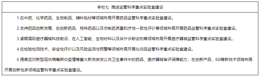 6.深入實(shí)施中國藥品監(jiān)管科學(xué)行動計(jì)劃。統(tǒng)籌推進(jìn)監(jiān)管科學(xué)研究基地和重點(diǎn)實(shí)驗(yàn)室建設(shè),開展監(jiān)管科學(xué)等研究。將藥品監(jiān)管科學(xué)研究納入國家相關(guān)科技計(jì)劃,重點(diǎn)支持中藥、疫苗、基因藥物、細(xì)胞藥物、人工智能醫(yī)療器械、醫(yī)療器械新材料、化妝品新原料等領(lǐng)域的監(jiān)管科學(xué)研究,加快新產(chǎn)品研發(fā)上市。支持國家審評、檢驗(yàn)、評價(jià)、核查等機(jī)構(gòu)參與國家相關(guān)科技項(xiàng)目,鼓勵開展藥品快速檢測新技術(shù)、藥品研發(fā)生產(chǎn)及質(zhì)量控制等研究,開展數(shù)字診療裝備、個(gè)體化診療產(chǎn)品、生物醫(yī)用材料的質(zhì)量評價(jià)、檢測技術(shù)及檢測規(guī)范等研究,開展化學(xué)藥品、疫苗、新型藥物和特殊藥物劑型等安全性、有效性評價(jià)技術(shù)以及創(chuàng)新醫(yī)療器械標(biāo)準(zhǔn)體系研究。鼓勵運(yùn)用現(xiàn)代科學(xué)技術(shù),結(jié)合我國傳統(tǒng)優(yōu)勢項(xiàng)目和特色植物資源,加強(qiáng)化妝品新原料研究。