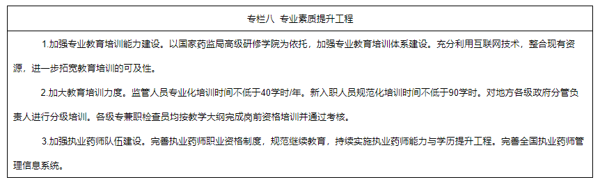 專業(yè)人才隊(duì)伍建設(shè)取得較大進(jìn)展。培養(yǎng)一批具備國際先進(jìn)水平的高層次審評員、檢查員和檢驗(yàn)檢測領(lǐng)域?qū)I(yè)素質(zhì)過硬的學(xué)科帶頭人。藥品監(jiān)管隊(duì)伍專業(yè)素質(zhì)明顯提升,隊(duì)伍專業(yè)化建設(shè)取得積極成效。