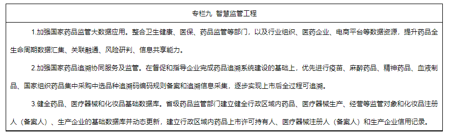 1.建立健全藥品信息化追溯體系。落實(shí)藥品上市許可持有人追溯主體責(zé)任。完善藥品信息化追溯體系,構(gòu)建國家藥品追溯協(xié)同服務(wù)和監(jiān)管體系,推進(jìn)藥品追溯信息互通共享,實(shí)現(xiàn)重點(diǎn)類別藥品全過程來源可溯、去向可追。逐步實(shí)施醫(yī)療器械唯一標(biāo)識,完善醫(yī)療器械唯一標(biāo)識數(shù)據(jù)庫,加強(qiáng)在上市后監(jiān)管、醫(yī)療管理、醫(yī)保管理等領(lǐng)域的銜接應(yīng)用。