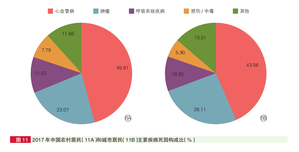 △城鄉(xiāng)居民疾病死亡構(gòu)成比中,心血管病占首位。2017年農(nóng)村和城市心血管病分別占死因的45.91%和43.56%,每5例死亡中就約有2例死于心血管病。
