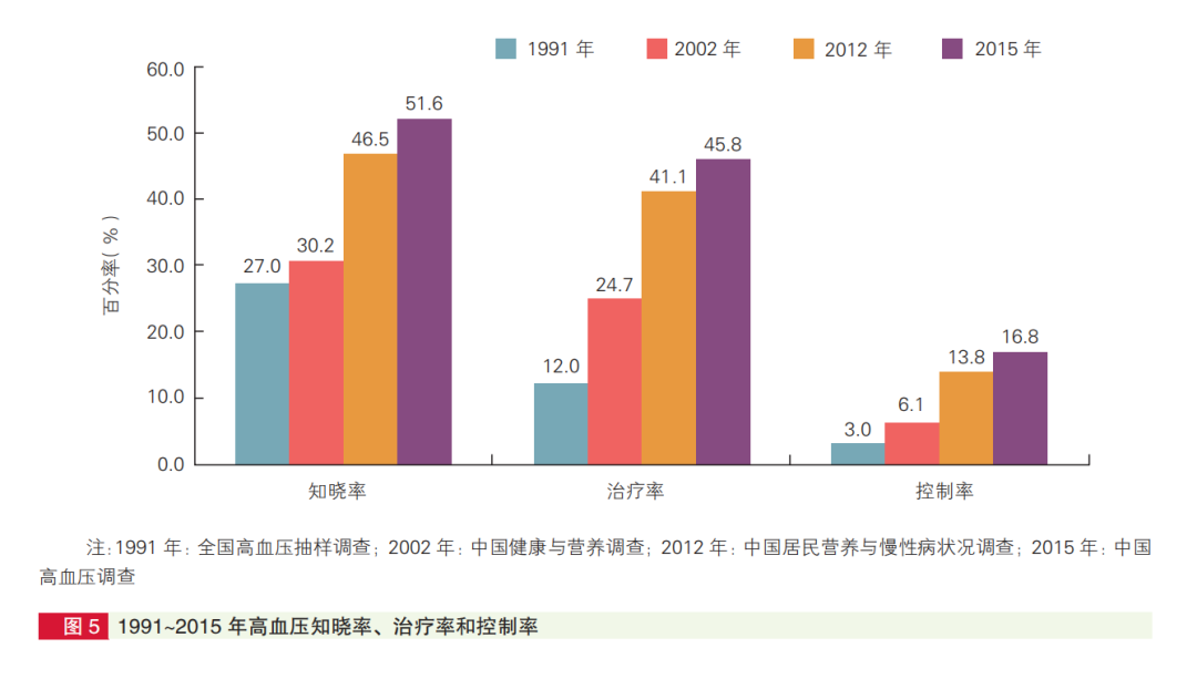 近年來(lái),高血壓的知曉率、治療率和控制率呈現(xiàn)出持續(xù)增長(zhǎng)趨勢(shì)。知曉率從1991年的27%升至2015年的51.6%,同期治療率從12.0%升至45.8%,控制率從3.0%升至16.8%。